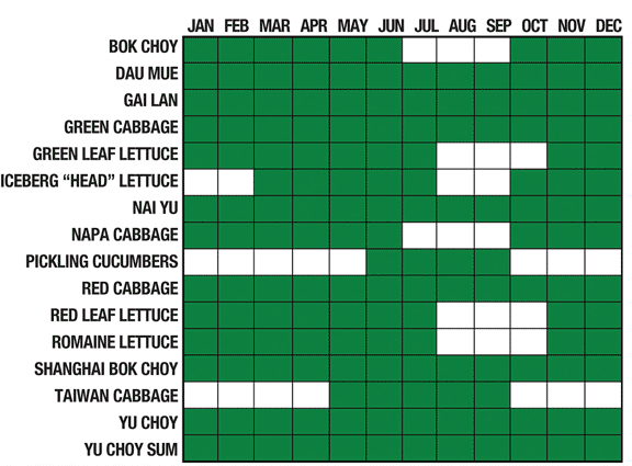 We have a variety of vegetables available through out the year. Green: Available that month White: Unavailable